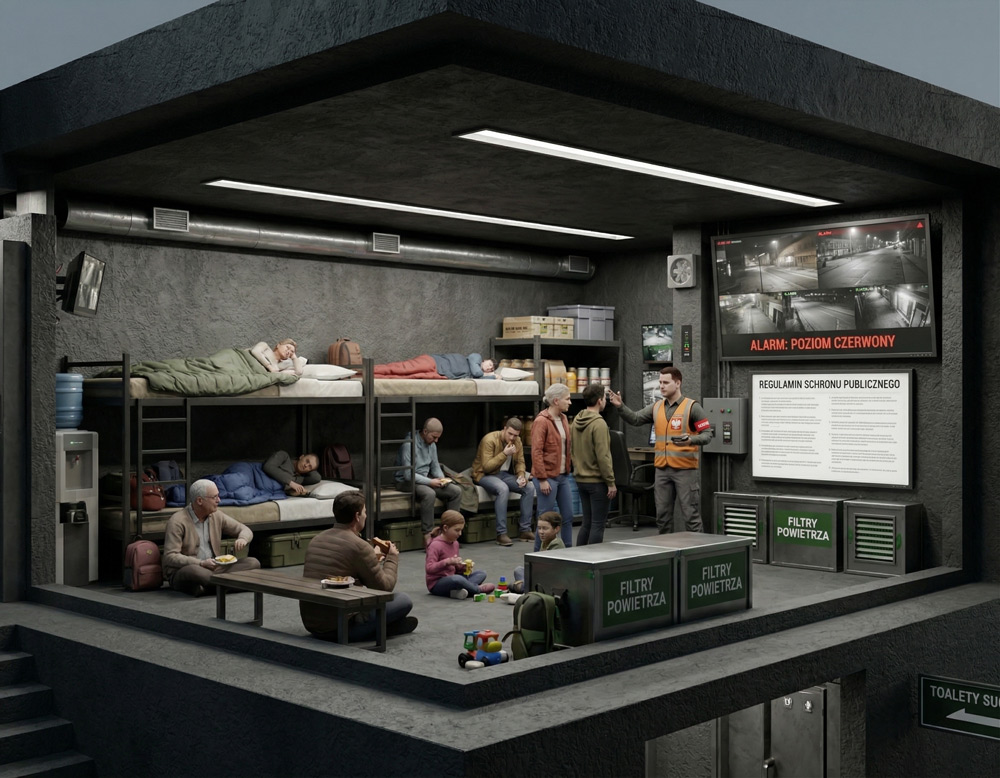 | Sytuacja alarmowa | Bezwzględne pierwszeństwo domowników (Gwarancja ustawowa): W sytuacji zagrożenia Twoje prawa są chronione ustawowo. Zgodnie z art. 104 ustawy o ochronie ludności i obronie cywilnej, obiekty zbiorowej ochrony znajdujące się w budynkach niepublicznych (czyli w domach prywatnych) są przeznaczone w pierwszej kolejności do ochrony użytkowników tego budynku. Oznacza to prawną gwarancję, że nikt nie ma prawa zająć miejsca Twojego i Twojej rodziny, a ewentualne dokwaterowanie osób postronnych przez służby może dotyczyć wyłącznie wolnych miejsc (nadwyżki pojemności). Udostępnienie osobom trzecim (Dwa tryby prawne): Tryb dobrowolny (Umowny): Właściciel może zawrzeć z gminą porozumienie o udostępnieniu schronu sąsiadom (często w zamian za dotację do 100% kosztów budowy lub wyposażenia). Wówczas udostępnienie następuje na zasadach ściśle określonych w tej umowie. Tryb nakazowy (Administracyjny): W sytuacjach ekstremalnych (przewidywana klęska żywiołowa, stan nadzwyczajny, wojna), organ ochrony ludności (np. Wójt) może wydać polecenie udostępnienia budowli ochronnej innym osobom. Władztwo wewnątrz schronu (Status Kierownika): Zgodnie z prawem (art. 100 ustawy), jeżeli nie wyznaczono innej osoby, kierownikiem budowli ochronnej jest jej właściciel. Rozporządzenie MSWiA z 1 lipca 2025 r. (§ 6) nadaje właścicielowi w czasie użycia schronu szerokie uprawnienia władcze i decyzyjne: · Wydawanie poleceń: Masz prawo wydawać wiążące polecenia wszystkim osobom w schronie (również tym dokwaterowanym) w celu zapobieżenia panice i zapewnienia bezpieczeństwa. · Prawo usunięcia: Masz prawo nakazać opuszczenie budowli osobom niestosującym się do Twoich poleceń. · Decyzje systemowe: To Ty podejmujesz decyzję o uruchomieniu instalacji filtrowentylacyjnej, hermetyzacji obiektu oraz przełączeniu na zasilanie awaryjne. Zakaz demontażu: Bezwzględnie zabrania się demontażu elementów płaszczyzny ochrony i hermetyzacji (drzwi pancernych, zaworów, klap wywiewnych). Filtry: Dopuszcza się, aby filtry i filtropochłaniacze w czasie pokoju były przechowywane w fabrycznych opakowaniach wewnątrz schronu, a ich montaż następował dopiero w fazie przygotowania do użycia (co chroni je przed zużyciem). Obsługa: Właściciel ma obowiązek sprawdzać stan techniczny i uruchamiać kluczowe urządzenia. | Tryb Uruchomienia (Polecenie i Ocena): Otwarcie schronu następuje na podstawie formalnego polecenia udostępnienia budowli ochronnej, wydawanego przez właściwy organ ochrony ludności (wójta, starostę lub wojewodę) w sytuacji zagrożenia. Rola Organu: Przed zasiedleniem terytorialny organ ochrony ludności dokonuje szybkiej oceny wizualnej stanu technicznego konstrukcji i szczelności zamknięć oraz dostarcza i montuje filtry i materiały eksploatacyjne przechowywane w czasie pokoju w magazynach. Przygotowanie Obiektu (Obowiązki Zarządcy): Właściciel lub zarządca ma obowiązek natychmiast przerwać dotychczasowe użytkowanie obiektu (np. jako garaż/metro) i wykonać czynności określone w § 3 rozporządzenia eksploatacyjnego: · Dostępność: należy usunąć zbędne wyposażenie i pojazdy oraz otworzyć na stałe drzwi wejściowe i ewakuacyjne (do momentu zakończenia obsadzania schronu). · Systemy: należy sprawdzić działanie instalacji elektrycznej, wentylacyjnej i oświetlenia awaryjnego. · Zabezpieczenie: należy zabezpieczyć wejścia przed skutkami intensywnych opadów atmosferycznych. Zarządzanie i Reżim Bezpieczeństwa (Zakazy): Władzę w obiekcie obejmuje kierownik budowli ochronnej, korzystający z ochrony prawnej funkcjonariusza publicznego. Zgodnie z § 6 rozporządzenia eksploatacyjnego, kierownik ma prawo: · Wydawać wiążące polecenia osobom chronionym w celu zapobieżenia panice. · Nakazać opuszczenie budowli ochronnej osobom, które nie stosują się do jego poleceń lub poleceń personelu. · Wyznaczyć doraźnie osoby do pomocy spośród ludności cywilnej przebywającej w schronie, jeśli obsada etatowa jest niewystarczająca do obsługi urządzeń lub zapewnienia porządku. Kierownik samodzielnie podejmuje decyzje o: · Uruchomieniu systemów filtrowentylacyjnych i hermetyzacji obiektu. · Ewakuacji ludzi ze schronu, jeżeli stwierdzi, że przebywanie w nim stwarza zagrożenie (np. w przypadku pożaru wewnętrznego lub uszkodzenia konstrukcji) W schronach powyżej 120 osób organ (w porozumieniu z właścicielem) zapewnia dodatkową obsługę. W czasie przebywania ludzi, zgodnie z § 62 warunków technicznych, w schronie niedopuszczalne jest stosowanie: instalacji i zbiorników z gazem (np. butli propan-butan), sufitów podwieszanych oraz elementów wyposażenia z palnych tworzyw sztucznych (np. pianek poliuretanowych), które w razie pożaru wydzielają toksyny. Zakończenie i Wnioski: Po odwołaniu polecenia przez organ ochrony ludności, zarządca przeprowadza procedurę odtworzeniową (czyszczenie, opróżnienie toalet, demontaż zużytych filtrów). Dodatkowo, zarządca ma obowiązek opracować wnioski dotyczące przebiegu schronienia, które zostaną wykorzystane w przyszłych szkoleniach personelu obsługi. |