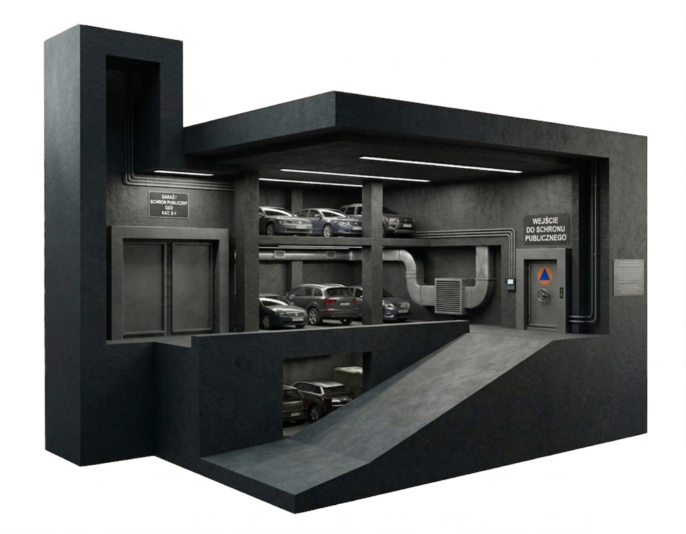 | Projektowanie | Dokumentacja projektowa: Procedura zgłoszenia budowy wolno stojącej przydomowej budowli ochronnej o powierzchni użytkowej do 35 m² (zgodnie z art. 29 ust. 1 pkt 2a ustawy Prawo budowlane) choć jest prostsza to i tak wymaga przygotowania profesjonalnej dokumentacji. Inwestor musi dołączyć do zgłoszenia projekt zagospodarowania działki lub terenu oraz projekt architektoniczno-budowlany. Dodatkowo, zgodnie z art. 42 Prawa budowlanego, przed rozpoczęciem robót budowlanych inwestor musi zapewnić sporządzenie projektu technicznego (zawierającego m.in. niezbędne obliczenia konstrukcyjne), który musi być dostępny na terenie budowy. Dobór standardu (Kluczowe różnice): Inwestor musi wybrać kategorię obiektu, co determinuje koszty i stopień ochrony: · Schron (Kategorie S-1 do S-3): Obiekt o konstrukcji hermetycznej. Bezwzględnie wymaga instalacji wentylacji mechanicznej z filtrowentylacją (zapewniającą ochronę przed skażeniami) oraz musi posiadać śluzę powietrzną (lub przedsionek ochronno-hermetyczny). · Ukrycie (Kategorie U-1 do U-3): Obiekt o konstrukcji niehermetycznej. Przepisy dopuszczają w nim stosowanie wentylacji grawitacyjnej (lub mechanicznej bez wymogu filtrowentylacji). Chroni głównie przed czynnikami mechanicznymi (gruz, odłamki), a kategoria U-3 dodatkowo przed falą nadciśnienia. Każda budowla ochronna o pojemności powyżej 10 osób musi posiadać co najmniej jedno wyjście zapasowe zlokalizowane poza strefą prognozowanego zagruzowania. Dla budowli mniejszych (do 10 osób) zaleca się wykonanie wyłazu awaryjnego, jeżeli wejście główne jest narażone na zasypanie. | Zasada podwójnej funkcji (Dual Use): Zgodnie z art. 92 ust. 5 ustawy o ochronie ludności, budowle ochronne należy projektować jako obiekty o podwójnej funkcji, umożliwiające ich codzienne, ekonomiczne wykorzystanie (np. jako garaż podziemny, stacja metra, magazyn, obiekt sportowy), przy jednoczesnym zachowaniu gotowości do szybkiego przekształcenia w funkcję ochronną. Konstrukcja, Odporność i Sytuowanie: · Kategorie: Projekt musi spełniać wymogi dla określonej kategorii odporności: S-1, S-2 lub S-3 (dla schronów) lub U-1, U-2, U-3 (dla ukryć). Kategorie te determinują wytrzymałość na nadciśnienie fali uderzeniowej (od 100 kPa do 300 kPa dla schronów) oraz grubość osłon przed promieniowaniem. · Bezpieczne odległości: Lokalizacja musi uwzględniać nie tylko zagrożenie powodziowe, ale także minimalne odległości od infrastruktury niebezpiecznej (określone w załączniku do rozporządzenia technicznego), np. od gazociągów, zbiorników paliw czy linii energetycznych wysokiego napięcia. · Norma powierzchniowa: Projekt musi zakładać powierzchnię netto nie mniejszą niż 1 m² na osobę, zapewniając bezpieczne przebywanie i poruszanie się. · Bezpieczeństwo Pożarowe i Strefowanie: Obiekt musi stanowić odrębną strefę pożarową. Wymagana jest konkretna klasa odporności ogniowej elementów konstrukcji (ścian i stropów). Wewnątrz należy wydzielić cztery strefy o zróżnicowanym mikroklimacie i ciśnieniu: – Strefa czysta: Miejsca pobytu ludzi, magazyny żywności/leków. – Strefa umownie czysta: Toalety, kuchnie, magazyny techniczne. – Strefa umownie brudna: Akumulatorownia, przepompownia ścieków. – Strefa brudna: Przedsionki, śluzy, komory rozprężne (wymagana śluza powietrzna przy wejściu do schronu). Autonomia i Wyposażenie Techniczne: Obiekt musi posiadać pełną autonomię działania (standardowo min. 48 godzin w trybie filtrowentylacji). Wymaga to: · Zasilania awaryjnego: Dla schronów powyżej 300 osób obowiązkowy jest zespół prądotwórczy (agregat) z zapasem paliwa, umieszczony w wydzielonej strefie pożarowej. · Wody: Wymagany zapas wody (min. 3 dm³/osobę/dobę) musi podlegać okresowej wymianie i kontroli jakości (zaleca się stosowanie hermetycznych, atestowanych pojemników lub systemów cyrkulacji wody połączonych z instalacją). Dla schronów i ukryć kat. U-3 powyżej 300 osób bezwzględnie obowiązkowe jest wykonanie zapasowego ujęcia wody (studni wierconej) wewnątrz obiektu, zasilanego awaryjnie. · Wentylacji: System musi zapewniać pracę w trybach: wentylacji czystej, filtrowentylacji oraz pełnej izolacji (z regeneracją powietrza lub zapasami sprężonego powietrza). Wyjścia i Dostępność: · Liczba wyjść: Ze strefy ochronnej o pojemności powyżej 50 osób należy zapewnić co najmniej dwa wyjścia (w tym jedno może być wyjściem zapasowym poza strefę zagruzowania). · Dostępność: Projekt musi uwzględniać potrzeby osób ze szczególnymi potrzebami. Dostępność zapewnia się m.in. przez urządzenia dźwigowe, pochylnie lub rampy (zasilane awaryjnie, jeśli to windy) oraz toalety przystosowane dla osób z niepełnosprawnościami. |