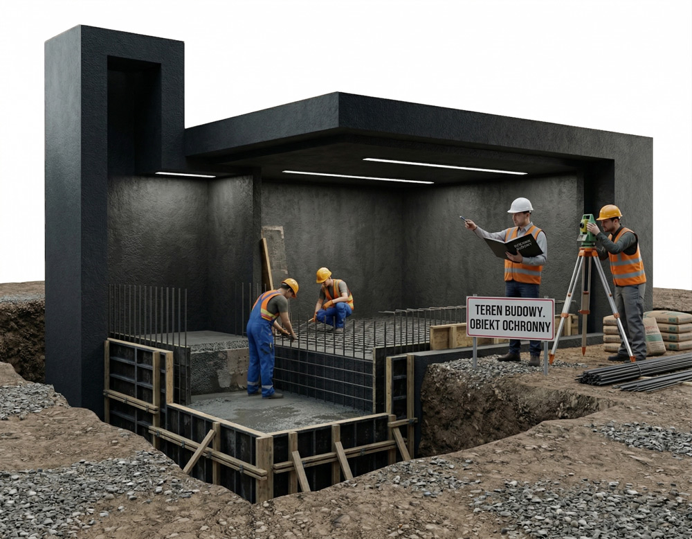 | Realizacja budowy | Nadzór i Kierownik Budowy (Obowiązek bezwzględny): W przeciwieństwie do budowy małych domów (do 70 m²), budowa przydomowej budowli ochronnej (wymienionej w art. 29 ust. 1 pkt 2a ustawy Prawo budowlane) bezwzględnie wymaga ustanowienia kierownika budowy oraz prowadzenia dziennika budowy. Wynika to wprost z art. 42 ust. 1 pkt 2 lit. b ustawy Prawo budowlane, który nie przewiduje zwolnienia z tego obowiązku dla budowli ochronnych. Kierownik budowy odpowiada m.in. za potwierdzenie prawidłowości wykonania robót ulegających zakryciu (m.in. zbrojenia, hydroizolacji), co jest kluczowe dla bezpieczeństwa konstrukcji. Reżim technologiczny i zakazy instalacyjne: Prace muszą być realizowane ściśle według projektu technicznego i zgodnie z przepisami prawa, w tym: · Konstrukcja: Wymagane jest stosowanie żelbetu o konkretnej klasie betonu (o najmniej C25/30 w przypadku ukryć oraz co najmniej C30/37 w przypadku schronów) oraz zachowanie minimalnej grubości osłon dla zapewnienia ochrony przed przebiciem odłamkami. · Zakaz gazu: Wewnątrz budowli ochronnej zabrania się prowadzenia instalacji gazowych oraz umieszczania urządzeń zasilanych gazem. Naruszenie tego zakazu dyskwalifikuje obiekt jako schron/ukrycie. · Materiały wykończeniowe: Zabrania się stosowania w strefie ochronnej (z wyjątkiem miejsc do spania/siedzenia) materiałów z palnych tworzyw sztucznych wydzielających toksyczne produkty rozkładu (np. paneli PVC, styropianu, pianek). Obowiązki geodezyjne: Inwestycja podlega obowiązkowej obsłudze geodezyjnej. Zgodnie z art. 43 ust. 1 ustawy Prawo budowlane, obiekt ten (jako wymieniony w art. 29 ust. 1 pkt 2a) wymaga geodezyjnego wytyczenia w terenie przed rozpoczęciem prac oraz sporządzenia geodezyjnej inwentaryzacji powykonawczej po ich zakończeniu. Mapa z inwentaryzacją jest niezbędnym załącznikiem do formalnego odbioru budynku. Dokumentacja kosztowa (Dotacje): W trakcie budowy inwestor powinien precyzyjnie dokumentować wydatki (faktury, protokoły odbioru) związane z zapewnieniem funkcji ochronnej (np. koszt drzwi hermetycznych, wzmocnionego zbrojenia, filtrowentylacji). Zgodnie z art. 106 ustawy o ochronie ludności i obronie cywilnej, możliwe jest ubieganie się o dotację celową na budowę lub przebudowę budowli ochronnej. Brak dokumentacji na etapie realizacji może uniemożliwić rozliczenie dotacji. Zakończenie budowy: Formalne zakończenie inwestycji następuje poprzez złożenie zawiadomienia o zakończeniu budowy do Powiatowego Inspektora Nadzoru Budowlanego (PINB). Do zawiadomienia należy dołączyć m.in. dziennik budowy, oświadczenie kierownika budowy o zgodności wykonania z projektem i przepisami oraz inwentaryzację geodezyjną. Przystąpienie do użytkowania jest możliwe, jeżeli organ nie wniesie sprzeciwu w terminie 14 dni (tzw. milcząca zgoda). | Realizacja i Nadzór (Reżim Prawa Budowlanego): Proces budowy obiektu publicznego odbywa się w reżimie Prawa zamówień publicznych. Z uwagi na znaczny stopień skomplikowania robót (konstrukcje hermetyczne, specjalistyczne instalacje), inwestor ma obowiązek ustanowić inspektora nadzoru inwestorskiego oraz zapewnić nadzór autorski projektantów. Zgodnie z Załącznikiem do rozporządzenia technicznego, konstrukcja musi być wykonana z materiałów gwarantujących odporność na obciążenia wyjątkowe (wybuch, zagruzowanie). Wymagany jest żelbet o klasie wytrzymałości co najmniej C25/30 (dla ukryć) lub C30/37 (dla schronów). Stal zbrojeniowa musi posiadać odpowiednią klasę ciągliwości w celu absorpcji energii wybuchu. Próby Szczelności i Testy Specjalistyczne (Przed zgłoszeniem do odbioru): Kluczowym etapem, odróżniającym schron od zwykłej piwnicy, są próby końcowe potwierdzające hermetyczność i sprawność systemów podtrzymywania życia: · Próba nadciśnieniowa: Dla schronów (kat. S) i ukryć hermetycznych (kat. U-3) wykonawca musi przeprowadzić test szczelności płaszczyzny ochrony poprzez wytworzenie nadciśnienia i pomiar jego spadku w czasie. Wymagana szczelność zamknięć (drzwi, klap) musi gwarantować, że przepływ powietrza jest zgodny w wymogami prawnymi. · Testy urządzeń: Sprawdzenie działania automatycznych zaworów przeciwwybuchowych (odporność na falę uderzeniową) oraz wydajności układu filtrowentylacyjnego w reżimach: wentylacji czystej, filtrowentylacji (praca na filtrach) i pełnej izolacji (jeśli dotyczy). Procedura Odbiorowa (Rozszerzona rola PSP): Przed złożeniem wniosku o pozwolenie na użytkowanie do nadzoru budowlanego, inwestor ma obowiązek zawiadomić służby: · Państwową Straż Pożarną (PSP): Komendant Powiatowy (Miejski) PSP przeprowadza kontrolę w rozszerzonym zakresie. Zgodnie z art. 107 ust. 2 ustawy o ochronie ludności, straż sprawdza nie tylko bezpieczeństwo pożarowe, ale także spełnianie wymagań dla budowli ochronnych oraz ich wyposażenia (np. obecność masek, apteczek, sprzętu ratunkowego, agregatów). Stwierdzenie nieprawidłowości skutkuje decyzją nakazującą ich usunięcie. · Państwową Inspekcję Sanitarną (PIS): Weryfikacja warunków higieniczno-sanitarnych (woda, ścieki, jakość powietrza). Dokumentacja Powykonawcza i Cyfryzacja (c-KOB): Inwestor przekazuje zarządcy obiektu komplet dokumentów niezbędnych do legalnej eksploatacji: · Geodezyjna inwentaryzacja powykonawcza: Niezbędna do ustalenia precyzyjnych danych lokalizacyjnych (współrzędnych) wymaganych w systemie ewidencji. · Cyfrowa Książka Obiektu Budowlanego (c-KOB): Właściciel/zarządca ma obowiązek założyć książkę w systemie c-KOB w terminie 30 dni od uzyskania pozwolenia na użytkowanie. · Książka obsługi urządzeń: Dokumentacja techniczno-ruchowa (DTR) dla urządzeń filtrowentylacyjnych i agregatów, wymagana do bieżącej obsługi serwisowej (zgodnie z § 63 rozporządzenia o warunkach eksploatacji). Oznakowanie i Wyposażenie (Gotowość operacyjna): P